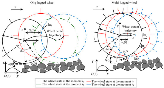 In an actual situation, the surface of HT is rugged, as shown in Figure 4. The class of wheel–HT interaction is ALCT. The wheel movement on the terrain is similar to the wheel movement on a reference terrain. The characteristics of the wheel movement are irrelative to the state of the wheel at the initial time. Thus, this paper assumes that the lug starts to contact the terrain at the initial moment t1. The terrain coordinate system O-XY is located at the terrain surface. The X-axis is parallel to the horizontal direction, and the Y-axis coincides with the y-axis. The roughness function of the terrain is expressed as g(X). The distance h(t) between the lowest point of the wheel rim and the terrain surface is