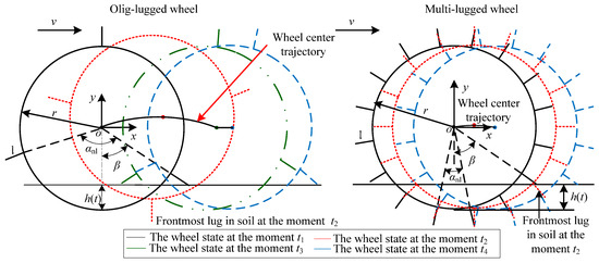 where is the position of the top point on the lug starting to enter the soil on the y-axis, β is the angle between the lug starting to enter the soil and gravity direction. The positions of the top points on two adjacent lugs on the y-axis are expressed as and , respectively. They have the relationship when the wheel–terrain interaction condition, including the terrain properties, slip ratio of the wheel, angular velocity of the wheel, load of the wheel, and so on, remains unchanged. Thus, the position of the top points on the frontmost lug in soil on the y-axis at moment t is . It can be used to calculate the distance h(t) at moment t. Therefore,