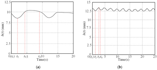 The distance h(t) between wheel rim’s lowest point and terrain surface, (a) when an olig-lugged wheel moves on ST, (b) when a multi-lugged wheel moves on ST. The black solid line represents the acceleration signal, the red dashed line represents the time point, and the black dashed line represents the coordinate grid.