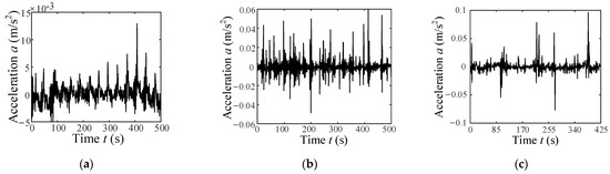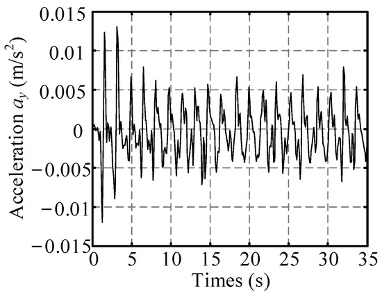 According to the wheel’s vertical vibration displacement y(t) in Equation (49), its vertical vibration acceleration can be expressed as (where is a constant component of y). The vertical vibration acceleration of the wheel can be regard as an approximate period signal, for example, the vertical acceleration of the wheel is an approximate period signal as shown in Figure 8 when the wheel moves on ST. The Fourier-series expansion of a periodic acceleration signal is described as follows: