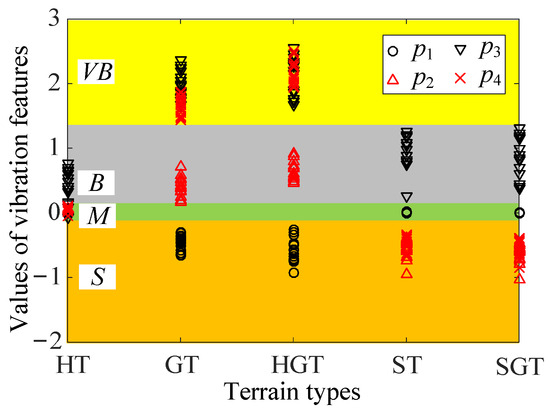 (2) A vibration-based method for WTIC recognition without requirement of training data is proposed. The regions of the vibration feature space for three WTICs are analyzed. The WTICs are determined by judging which feature space region the wheel–terrain interaction is located in. Experiment results of the single-wheel test show the simple and effective method has recognized 292 samples out of 300 samples correctly, so the recognition accuracy is about 97%.