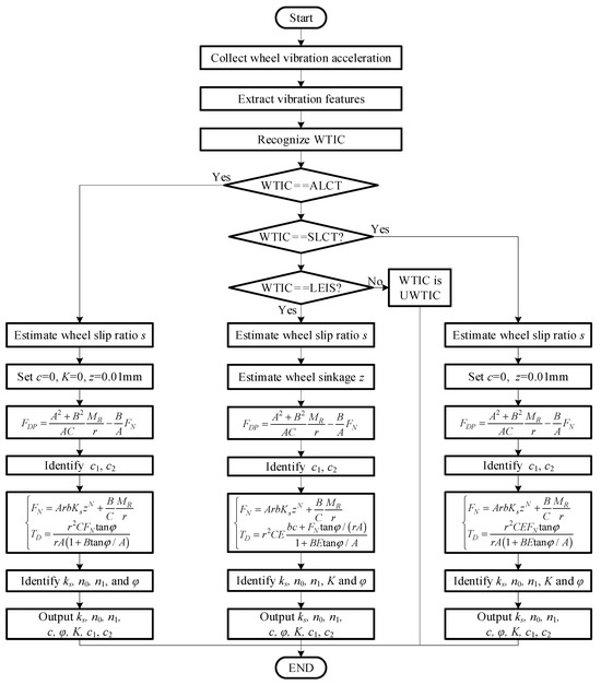 In this paper, the speed-independent vibration features are extracted to recognize WTIC first. Terrain parameters in the terramechanics model that is switched to corresponding to the recognized WTIC are then identified. This paper comprehensively utilizes various sensors installed on the planetary rovers, including accelerometers, cameras, and six-dimensional force/torque sensors, to achieve the recognition of WTIC and identification of terrain parameters. The accelerometer is used to collect wheel vibration acceleration data. Speed-independent vibration features are extracted from the acceleration data to recognize WTIC and select the corresponding terramechanics model. The camera can obtain wheel–terrain interaction images to realize the estimation of wheel sinkage and slip ratio using machine vision technology. The wheel–terrain interaction force information of the rover wheel is acquired using the six-dimensional force/torque sensor. Then, the wheel–terrain interaction force, wheel sinkage and slip ratio are input into the terramechanics model to identify terrain parameters.