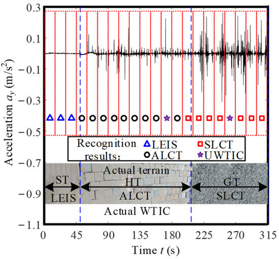 A single dataset consists of vibration data from an about 55 s traversal period. The acceleration signals are segmented with 15 s long intervals to recognize WTIC. Table 5 show the results for the WTIC recognition of single-terrain datasets. They demonstrate an excellent performance of the WTIC recognition method proposed in this paper in distinguishing the WTICs. The results show that 133 samples of 144 wheel–HT interaction (which belongs to ALCT) are recognized as ALCT, and the recognition accuracy reaches 92.36%. Ten samples of wheel–GT interaction (which belongs to SLCT) are misclassified as UWTIC, i.e., 93.06% of the wheel–GT interactions are classified as SLCT. All wheel–ST interaction samples are recognized as LEIS, and the accuracy attains 100%. No misidentification occurred among the three WTICs. The results show that the WTIC recognition algorithm has a high level of accuracy and can effectively distinguish the WTICs.