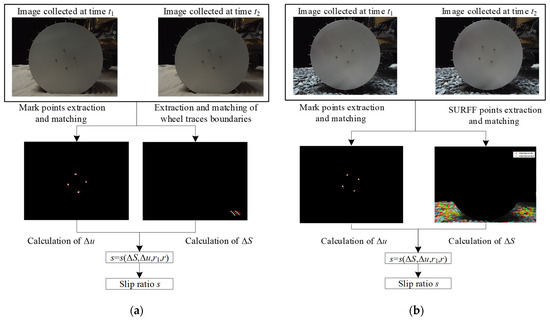 As shown in Figure 22a, the boundaries of the wheel trace were extracted from wheel–terrain images acquired at adjacent moments and were matched to estimate the forward displacement ΔS of the wheel. Meanwhile, the mark points (in this paper, the screws on the wheel are regarded as mark points) of the wheel were also extracted from wheel–terrain images acquired at adjacent moments and were matched to estimate the average displacement Δu of the mark points relative to the wheel center. The slip ratio can then be calculated using Equation (77) according to ΔS and Δu.