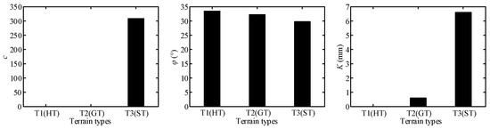 Terrain parameters can be divided into three groups, namely, PI = {c1, c2}, PII = {ks, n0, n1}, and PIII = {c, φ, K}, which are directly related to angles of θm and θ2, normal stress, and shearing stress, respectively. The results of terrain parameter identification using the algorithm in Figure 15 are shown in Table 6. Figure 23 and Figure 24 show comparison of the parameters PII = {ks, n0, n1} and PIII = {c, φ, K} for three terrain classes, respectively, to clearly illustrate the difference in terrain parameters between the three terrain classes.