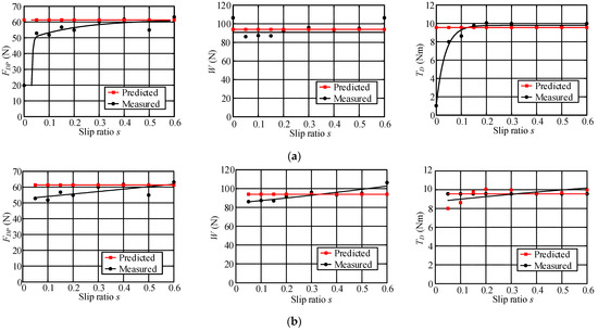 Figure 25a shows that the estimated values of FDP and TD differ greatly from the measured values when slip ratio is 0. And the maximum relative error of the estimated drawbar pull force is 65.8%, as shown in Table 7. However, the estimated FDP and TD are close to measured data except when the slip ratio is 0, as shown in Figure 25b. The relative errors of estimated drawbar pull force and driving torque in Figure 25b are both no more than 15.52%. When the slip ratio is zero, there is no relative movement between the wheel and terrain, and the drawbar pull force (friction force) of the wheel is static friction force. At this time, the actual drawbar pull force (friction force) is smaller than the dynamic friction force calculated according to φ (the friction coefficient between wheel and terrain is tan(φ)). Thus, the errors of the estimated drawbar pull force and the driving torque are large when slip ratio is zero. Figure 25b shows a comparison among the estimated values of the drawbar pull force, the normal load, and driving torque and the sensor measurement values when the slip ratio is bigger than zero. The fitting curve of estimated data is close to the fitting curve of measured data. The relative errors of estimated wheel–HT interaction force with identified terrain parameters are less than 16% when slip ratio is not zero.