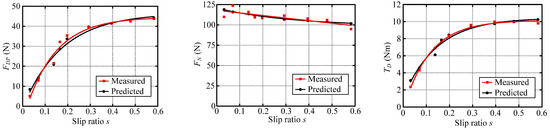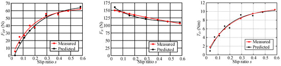 The drawbar pull force, normal load, and driving torque of the wheel are estimated using Equations (62)–(64) with the identified parameters. Figure 26 shows that the fitting curves of estimated wheel interaction force are close to the fitting curves of measured data. The maximum errors of estimated drawbar pull force, wheel load, and driving torque are 11.85%, 6.67%, and 8.46% respectively.