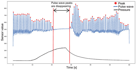 Pulse waveform of fingertip during compression of the upper arm. The vertical axis indicates the A/D-converted pulse wave and pressure sensor values, the horizontal axis indicates time, and the red circle indicates the pulse wave peaks.