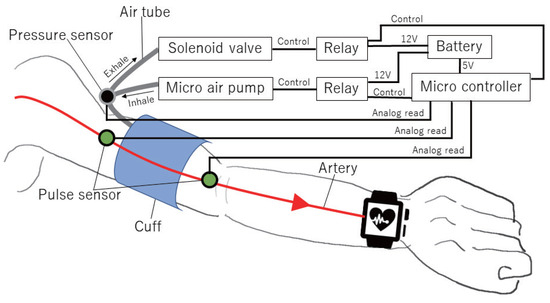 Figure 2 shows an overview of the proposed device. The device consists of a one-board micro controller, a circuit using mechanical relays, a compression cuff (hereinafter referred to as “cuff”), a micro air pump, a solenoid valve, pulse sensors, a pressure sensor, and a battery. The micro air pump and solenoid valve are connected to the cuff using tubing. The micro air pump blows air into the cuff to inflate it and compress the arm. The solenoid valve is used to vent the inside of the tube. The micro air pump and solenoid valve are controlled by a micro controller using a relay circuit. The pulse sensors are used to measure pulse waves at two points before and after passing through the proposed device. The pressure sensor is connected to the tube connected to the cuff and is used to measure the pressure value inside the cuff.