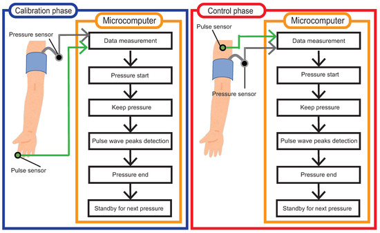 Figure 3 shows the process flow of the proposed method. As shown in Figure 3, the proposed method consists of two processing phases: calibration and control. Calibration is the phase that determines the suitable pressure value for the user and uses a pulse wave sensor attached closer to the fingertip than the cuffed position, as well as a barometric pressure sensor attached to the tube. After the calibration phase is finished, pulse wave control is performed. Control is the phase that actually controls blood flow, and it uses a pulse wave sensor attached closer to the heart than the cuffed position, as well as a pressure sensor attached to the tube. The calibration and control phases consist of six processes: data measurement, pressure start, keep pressure, pulse wave peaks detection, pressure end, and standby for next pressure. Each of these processes is described in detail in the following sections.