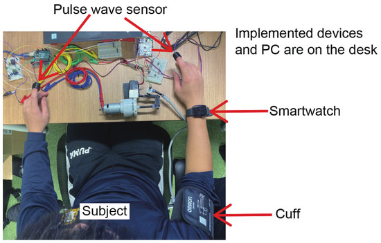 Scene of the subject during the experiment. Pulse sensors were attached to the index fingers of both hands. The pulse wave sensors were covered with black cloth tape to prevent the influence of ambient light. A cuff was attached to the right upper arm, and a smartwatch was attached to the right wrist (In this figure, an Apple device is worn). The implemented device and the PC are placed on the desk.