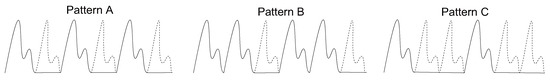 The five smartwatches were selected: a Fitbit Versa 2 (Fitbit) [24], an Apple Watch Series 6 (Apple) [25], a Polar Ignite (Polar) [26], a Garmin Swim 2 (Garmin) [27], and a Paenoon full-touch screen smartwatch (Paenoon). Among the five models, the Fitbit, Apple, Polar, and Garmin were allowed to measure heart rate data and submit the measured data from the health insurance service [3]. The heartbeat monitor on each smartwatch was video-recorded for 2 min. The reason for using video recordings was that heart rate data could not be extracted from the smartwatch. The video-recorded data were manually transcribed, with the values displayed frame-by-frame at 1 s intervals. The calibration of the implementation device was performed in advance, and the 2 min period began when the pulse wave control was started. Figure 5 shows pulse waveform images of the upper arm pressure patterns of the device in this experiment. The solid line indicates appearing pulse wave peaks, and the dotted line indicates disappearing pulse wave peaks. Pattern A was set when the number of pulse wave peaks to be disappeared and to appear were the same, pattern B was set when the number of pulse wave peaks to appear was larger than the number of pulse wave peaks to be disappeared, and pattern C was set when the number of pulse wave peaks to appear was smaller than the number of pulse wave peaks to be disappeared. Pattern A was designed to investigate the limitations of the proposed device, and Patterns B and C were designed to investigate the versatility of the proposed method.
