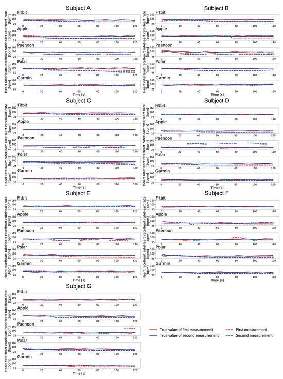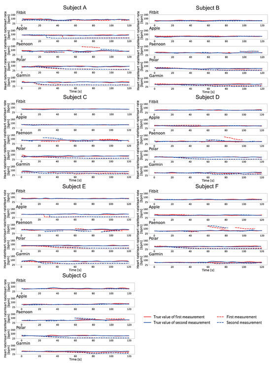 Figure 8 shows the change displayed in the heartbeat on the smartwatch when Pattern B was conducted at rest. The heart rate displayed on the smartwatch was recorded by video and manually written down frame-by-frame for 1 s at a time. The BPM was calculated based on the Equation (1). As shown in Figure 8, Fitbit showed a decrease in the heart rates for Subjects A–C. Apple showed a sudden decrease in heart rates in the second session for Subjects B, F, and G and in both sessions for Subjects A and D. Paenoon showed a sudden decrease in displayed heart rate, thereby displaying values of more than 20 BPM lower than the true values.In contrast, the second session for Subject D, the first session for Subject F, and the first session for Subject G showed that the displayed value had increased. Polar displayed 37–67 BPM values at the end of the session, except the second session for Subject E. Garmin showed a decrease of about 10–30 BPM from the true value at the end of the session in both sessions for Subjects D and E and in the first session for Subject G.