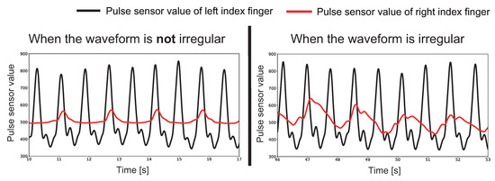 The theoretical value of Pattern A is supposed to be half of the true value. However, some sessions failed to achieve the theoretical value in some sessions. For example, the first session of the Garmin for Subject E displayed 52 BPM when the BPM was 83 BPM at the end of the session. This is because the waveform was more irregular than the natural pulse wave due to the short time between the compression and release actions. Figure 7 shows the actual waveforms measured in the first session of the Garmin for Subject E. As shown in Figure 7, the waveform of the index finger on the right hand was measured at around 15 s, since the measurement started was following Pattern A. On the other hand, the waveform of the right index finger was irregular at around 50 s from the start of the measurement. Therefore, it is necessary to improve the algorithm of the proposed method, such as the timing of compression, to make the pulse wave appear more natural. It is considered that the reason for the increase in the displayed value in the Paenoon may be the use of a threshold value in the onboard algorithm. When a peak disappears with the proposed method at the threshold setting timing, an incorrect threshold value is set. As a result, the peak could not be detected correctly. Therefore, it is necessary to perform pulse wave control based on the algorithm installed in the smartwatch.