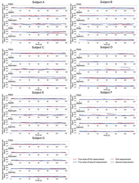 Figure 9 shows the change displayed in the heartbeat on the smartwatch when Pattern C was conducted at rest. The heart rate displayed on the smartwatch was recorded by video and manually written down frame-by-frame for 1 s at a time. The BPM was calculated based on the Equation (1). As shown in Figure 9, Polar showed a significant decrease in the displayed value, except for Subject F. The decrease trend for the displayed values was the same as in Pattern A and Pattern B. Fitbit confirmed the decrease in Subjects A–C, and it displayed a value of 55–67 BPM at the end of the session. Apple did not show a large decrease in the displayed value. Paenoon showed a decrease in the second session for Subject A, the first session for Subject C, and both sessions for Subjects B and E. In contrast, the displayed value increased from the true value at some time in the first session of Subject A, both sessions for Subject F, and the second sessions of Subjects C, D, and G. Garmin showed a decrease of 10 BPM or more at the end of the session in both sessions for Subjects A, B, and G and in the second session for Subject D.