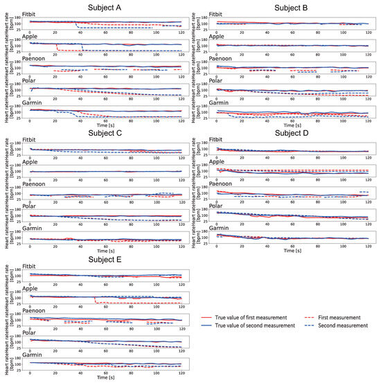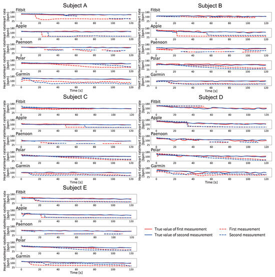Figure 12 shows the change displayed in the heartbeat on the smartwatch when Pattern B was conducted after exercise. The heart rate displayed on the smartwatch was recorded by video and manually written down frame-by-frame for 1 s at a time. The BPM was calculated based on the Equation (1). As shown in Figure 12, Paenoon and Polar showed a large decrease in all subjects. Polar displayed 40–88 BPM, and the displayed value varied in each session. Garmin showed a decrease of about 15–60 BPM in all sessions except the second sessions of Subjects C–E. In Apple’s second session for Subject A and the first session for Subject D, the displayed value decreased at the end of the session. In particular, 69 BPM was displayed at the end of the session in the second session of Subject A, when the true value of 131 BPM was displayed. Fitbit showed that the displayed heart rate decreased by 14–50 BPM at the end of all the sessions except for Subject A, the second session for Subject B, and the first session for Subject D. There was also a time during the session when the heart rate display disappeared.
