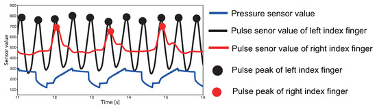 In this study, we assume that a user wears a wearable device such as a smartwatch equipped with a photoelectric pulse wave sensor (PPG sensor) on the user’s wrist. The photoelectric method uses an LED to irradiate light with a green wavelength near 550 nm onto the skin surface, and a photodiode on the skin surface receives the irradiated light reflected by body tissues. Since hemoglobin absorbs incident light, the pulse rate is measured by utilizing the fact that the reflected light decreases due to the increase in blood volume at the moment when the pulse wave arrives. Therefore, by compressing the upper arm and decreasing the blood volume, the sensor value becomes smaller at the end of the fingertips from the upper arm to the fingertips. Our research group has reported that the pulse wave is attenuated by sufficient pressure on the blood vessels [19].