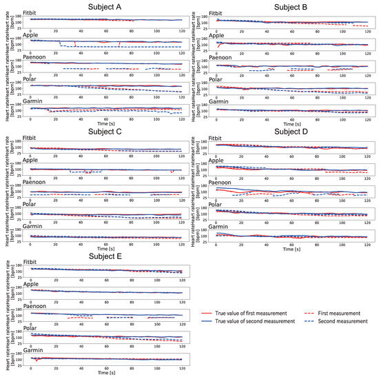 Table 5 shows the results of sessions that changed by more than 15 BPM from the actual BPM. As shown in Table 5, these results showed that the displayed values were lower than the true values for all the smartwatches in the experiment after-exercise environment, although these values depended on the pulse wave control pattern or subject. The results and considerations for each pattern are described in the following sections.