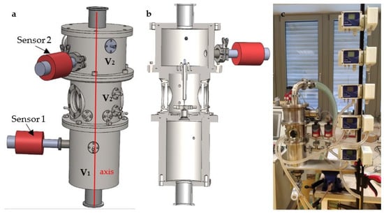 Pfeiffer probes were used as sensors that sensed the absolute pressure in the chambers. Their location can be seen in Figure 1, left; these are red probes inserted into the appropriate chamber. Their location is also shown in the diagram in Figure 2. According to the current measurements, the Pfeiffer CMR 361 sensors with a measuring range from 10 Pa to 110,000 Pa and the Pfeiffer CMR 362 sensor with a measuring range from 1 Pa to 1100 Pa are used.