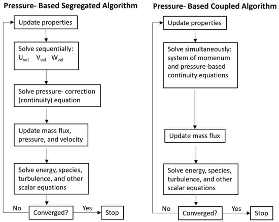 It is a Pressure-based solver that employs an algorithm that belongs to a general class of methods called the projection method []. In the projection method, the limitation of conservation of mass (continuity) of the velocity field is achieved by solving the pressure equation (or by correcting the pressure). Unlike the segregated algorithm described above, its scheme and comparison with the coupled variant are shown in Figure 3 [], and the pressure-based coupled algorithm solves a coupled system of equations comprising the momentum equations and the pressure-based continuity equation. Thus, in the coupled algorithm, Steps 2 and 3 in the segregated solution algorithm are replaced by a single step in which the coupled system of equations is solved. The remaining equations are solved in a decoupled fashion, as in the segregated algorithm. Since the momentum and continuity equations are solved in a closely coupled manner, the rate of solution convergence significantly improves when compared to the segregated algorithm. However, the memory requirement increases by 1.5–2 times that of the segregated algorithm since the discrete system of all momentum and pressure-based continuity equations needs to be stored in the memory when solving for the velocity and pressure fields (rather than just a single equation, as is the case with the segregated algorithm).
