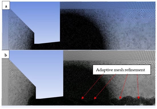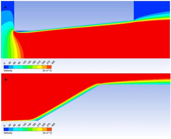 A suitably selected mesh was needed for the chosen mathematical-physics analysis, and the resulting computational mesh is a combination of a structured mesh with a 2D variant of hexagonal elements. The advantage of these meshes is that they conserve cells when meshing purely rectangular surfaces (Figure 2) and also reduce blurred results caused by possible errors in transferring results over oblique ones. A structured mesh cannot be used in the aperture and nozzle areas, so a triangular mesh has been used here. For the most accurate simulation, a significant refinement of the mesh was used in the area where supersonic flow is expected. Figure 4a shows the basic setting of the mesh with refinement in the area of expected more complex physical phenomena in flow and gradients []. During the calculation, manual adaptive refinement was also performed using the Field Variable method. The choice extent of mesh adaptation was chosen according to the maximum values in the cell derivative option, a gradient pressure, with a maximum refinement level of 4. As a result, pressure gradients in the supersonic flow regions in the nozzle were appropriately captured, as can be seen in Figure 4b. A mesh independence study was carried out for the inspection, which consisted of monitoring the course of the monitored variables after mesh refinement. Global parameters were monitored: absolute pressure, static temperature, velocity, and density.