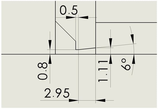 In the case of the designed nozzle, from the above relationships of the theory of isentropic one-dimensional flow (Equations (3)–(8)) based on the input critical cross-section of the nozzle with a diameter of 1.6 mm, an output cross-section with a diameter of 2.22 mm with a length of 0.5 mm and an opening angle of 12° according to [] was set (Figure 6).