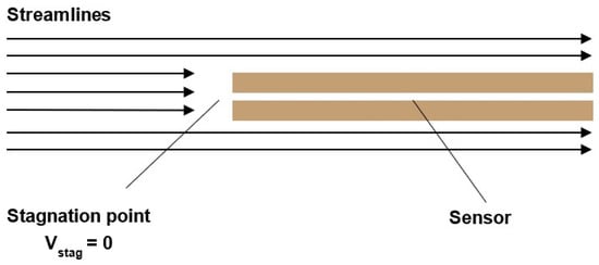 The first option is to insert a probe with a flat end into the stream, in front of which a perpendicular torn-off shock wave is created. At this point, we no longer sense the state quantities of static pressure and static temperature on the probe head; instead, we sense total pressure and stagnation temperature [,]. Using the stagnation temperature value, we can then calculate the static temperature. However, this method requires knowing the Mach number at the location of temperature sensing, which can sometimes be challenging. This leads to the necessity of performing velocity sensing at a specific location. One way to achieve this is by using a sensor based on a Pitot tube, which senses total pressure. However, capturing static pressure from the side of the tube is also necessary (Figure 1). This might pose a challenge in confined spaces.