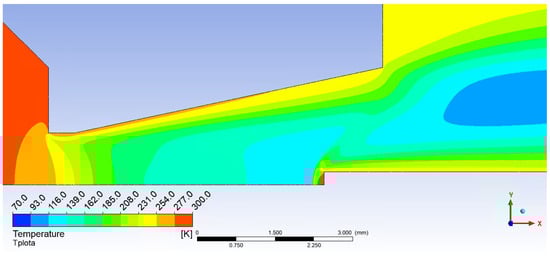 The results showed a changed character of the flow with a reduced tendency towards the formation of cross-oblique shock waves in the nozzle and the formation of shock waves with a greater thickness because the viscous forces further inhibited the formation of the thickening of the shockwave itself. This can affect temperature sensing with a sensor with a tip, as the shockwave area can form in a very small area in front of the tip, which can affect the result. Also, due to the reduced inertial forces, the angle of the cone shock wave is a few degrees larger than in theory; there is no such tilting due to the lower inertial forces.