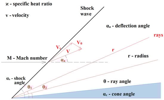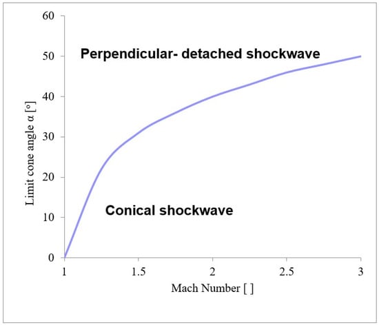 In the case of a perpendicular detached shock wave, there are sharp gradients behind it, and the temperature, density, and both total and static pressure change abruptly. For this case, there is a theory of one-dimensional isentropic flow for a perpendicular shock wave, which relates the Mach number, velocity, temperature, density, and both total and static pressure that enter and exit the shock wave (Equations (16)–(21)) [].