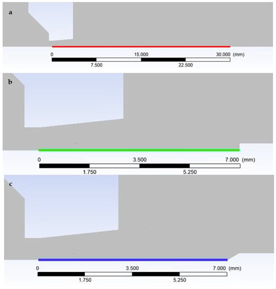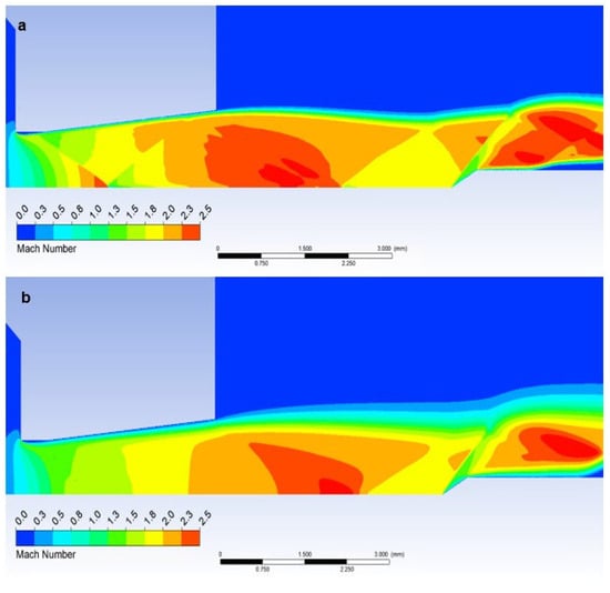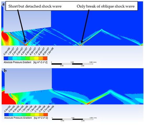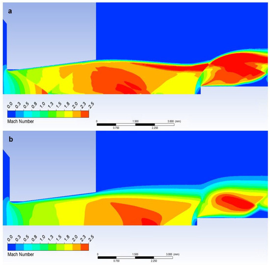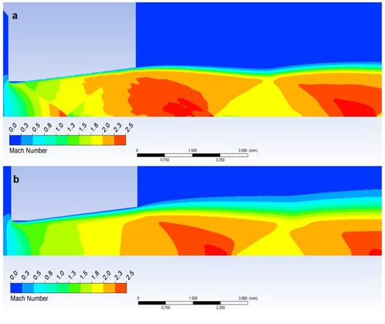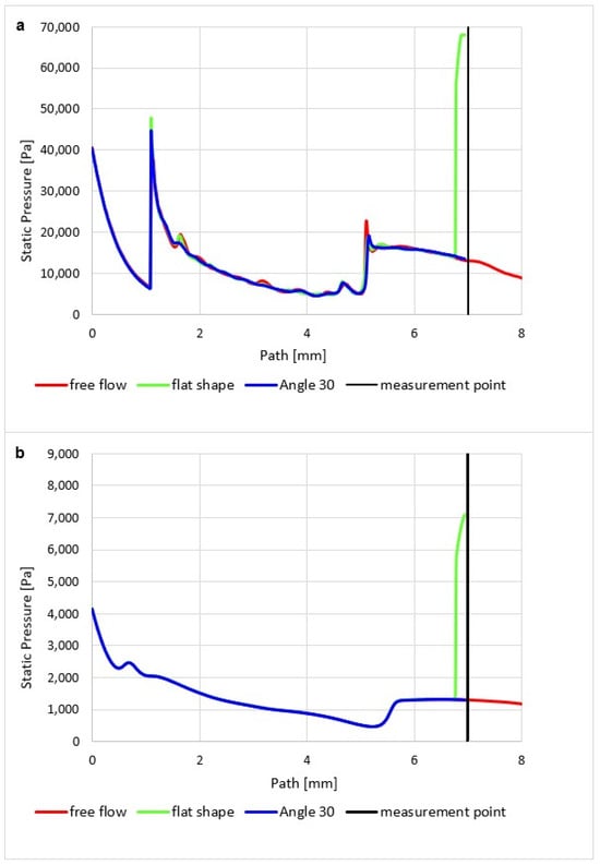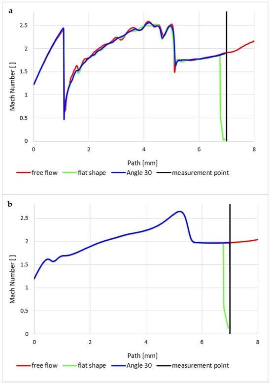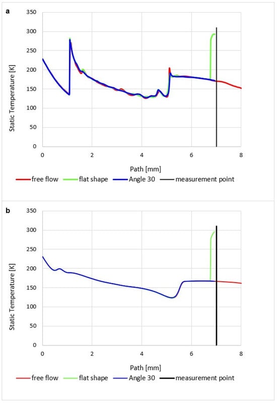 However, the effect of the difference in the ratio of inertial and viscous forces in both variants is manifested. Due to the greater thickness of the shock wave, there is a small increase in static pressure just before the tip, which is not visible in the graphics because it is at a distance of 0.007 mm (Figure 21b and Figure 22b). This must be considered when using a temperature sensor with a tip, as this small increase in static pressure is also reflected in an increase in static temperature (Figure 25b).