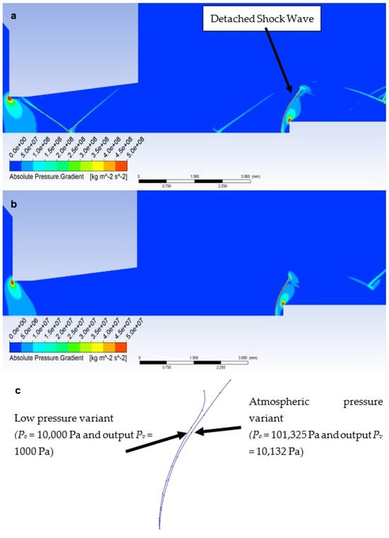 A small problem may arise with the low-pressure variant, where the different influence of the ratio of inertial and viscous forces in both variants takes place. Due to the greater thickness of the shockwave, a small increase in static pressure happens just before the tip, which is difficult to see in the graph as it is a distance of 0.007 mm (Figure 21b,c and Figure 26b). It has a value of up to 1500 Pa. This must be taken into account when using a temperature sensor with a tip, as this small increase in static pressure is also reflected in a static temperature increase of 78 K (Figure 28b and Figure 29b). In this case, it would be necessary to create the sensor tip with a significantly sharper tip angle, otherwise, the results would be distorted. When sensing the temperature, it is necessary to take into account the different shapes of the shockwave at low pressure.