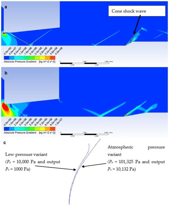 Analyses were performed for two pressure drops. The first one is the atmospheric pressure variant (Po = 101,325 Pa and output pressure Pv = 10,132 Pa, i.e., a ratio of 10:1). From the given ratio, the calculation dimension of the nozzle was further determined using the theory of one-dimensional isentropic flow (see below). Boundary conditions for the analyses are shown in Figure 2. Subsequently, for the same pressure ratio, an analysis was performed for the low-pressure variant (Po = 10,000 Pa and output pressure Pv = 1000 Pa).