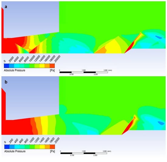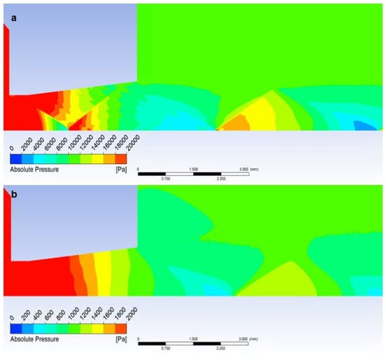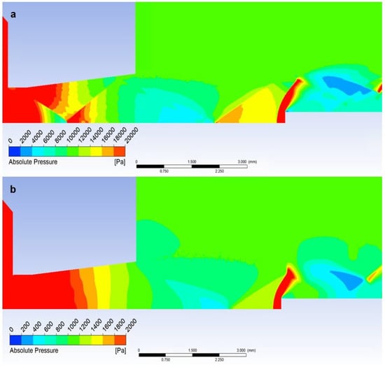 Distribution of Absolute Pressure (Static pressure) of an angle of 30° of (a) atmospheric pressure variant and (b) low-pressure variant.