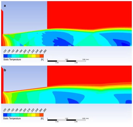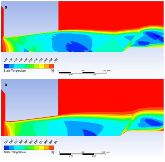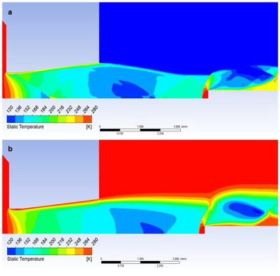 Distribution of Static temperature of Flat shape of (a) the atmospheric pressure variant and (b) the low-pressure variant.