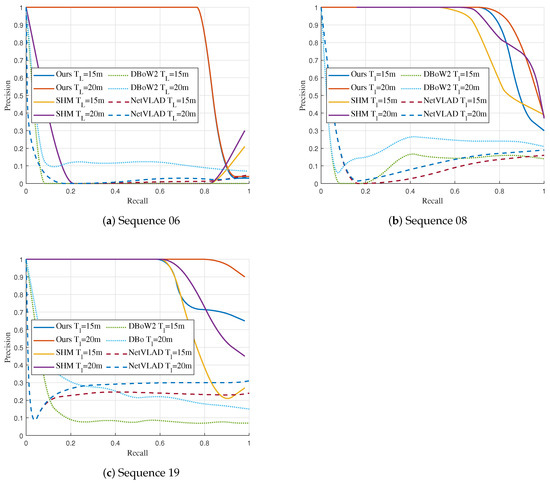 Precision-Recall curves (PR-curves) are employed to evaluate the position recognition performance of different algorithms under large view-point changes. In the PR curve, P stands for precision, and R stands for recall. In our experiments, each image represents a place to be recognized and localized. Precision evaluates the proportion of places recognized correctly, and recall denotes the ratio of the recognized places to all places to be recognized. The PR curve takes recall as the horizontal coordinate and precision as the vertical coordinate. Therefore, the PR curve achieves higher precision at higher recall, reflecting better algorithmic location recognition performance. The precision and recall are computed in Equations (7) and (8):