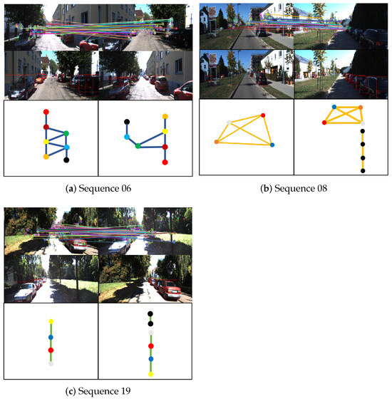 It is worth noting that the SHM method fails to succeed in place recognition on sequence 06. We attribute this primarily to two factors. On the one hand, the non-overlapping trajectories are offset in the horizontal direction, which causes some differences in the semantic information around the nodes in the two graphs, as shown in the left image of Figure 4. On the other hand, the semantic information on both sides of the road in the query graph and the database graph has high similarity. This scenario gives non-corresponding vertices high similarity, such as trees on the left in the query graph matching trees on the right in the database graph, leading to errors in matching and rigid transformation solving. Our landmark topology approach constructs descriptors by using transformation relations between vertices regarding poses and dimensions, allowing the descriptors to maintain specificity in this scenario and leading to high matching accuracy. The place recognition and vertex s matching results under large view-point variations are presented in Figure 6.