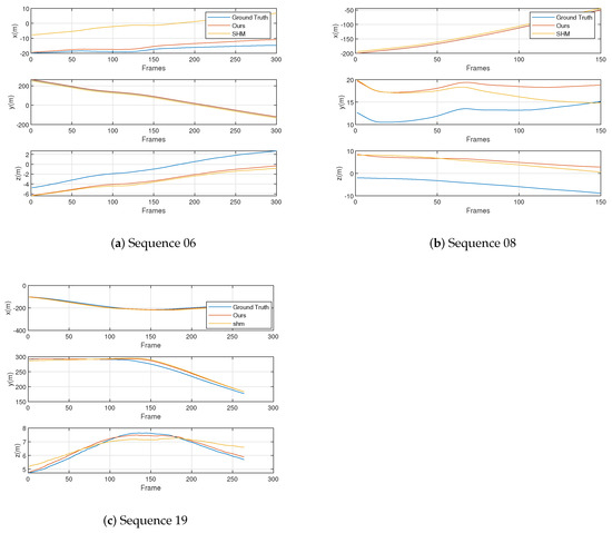 As shown by the results in Table 2, the appearance-based algorithm is unable to accomplish multi-camera localization under significant view-point changes, with the DBoW2 and NetVLAD algorithms exhibiting the largest localization error. Since the appearance-based method is frame-by-frame matching, we use the best matching inter-frame distance as the localization error. At the same time, according to the results in Figure 5, the appearance-based algorithms are unable to accomplish multi-camera localization under significant view-point changes, resulting in incorrect matching results. Therefore, there is a long distance between the best matching image frames, which makes the localization result based on the matching result wrong and has a large error. Our landmark topology algorithm outperforms the advanced SHM algorithm on all sequences due to higher matching accuracy. Specifically, all the mean and RMSE translation errors are less than 10 m, with a minimum mean error of 2.99 m, RMSE 3.93 m, and a maximum mean error of 6.16 m, RMES 6.18 m. Our algorithm has better performance on both the longest and the shortest trajectories. Compared to the SHM algorithm, the improvement is 29% (mean), 29% (RMSE) and 31% (mean), 28% (RMSE) on sequences 08 and 19, respectively, with the most significant advantage on the longer sequence 19.