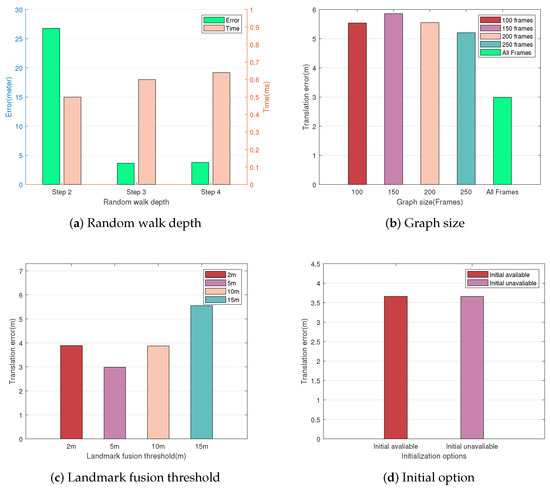 We first evaluate the global localization translation error, descriptor construction, and graph matching time under different random walk depths. We chose 2, 3, and 4 steps as the depths to construct our descriptors, respectively. The comparison results are illustrated in Figure 8a. The histogram clearly shows that the translation error is highest at 2 steps. The errors are approximated at depths of 3 and 4 steps, and both errors are less than 5 m. The results indicate that the time complexity of the algorithm tends to increase as the descriptors become complex. However, the localization accuracy does not increase significantly when the random walk depth exceeds 3 steps.