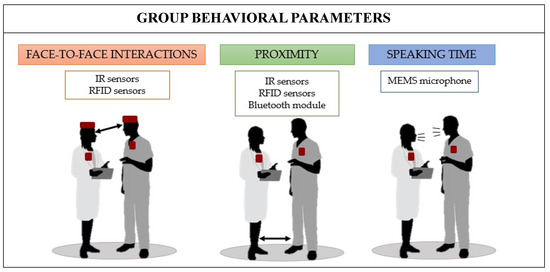 In the literature, the group parameters monitored for studying the social and organizational dynamics include the number of face-to-face interactions (F2Fs), proximity time, and speaking time, while the individual ones are the heart rate (HR), heart rate variability (HRV), respiratory rate (RR), galvanic skin response (GSR), and physical activity level [17,18,19,20].