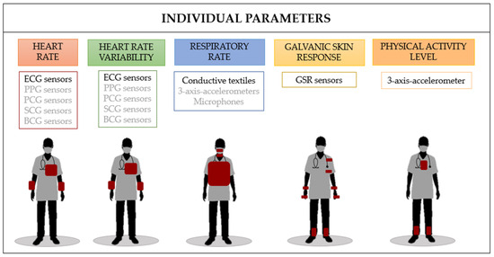 Sensors embedded into wearable devices used to monitor individual parameters and their body locations are shown. Those already used in real/simulated clinical settings are highlighted. The red parts highlight the possible position of the wearable sensors.