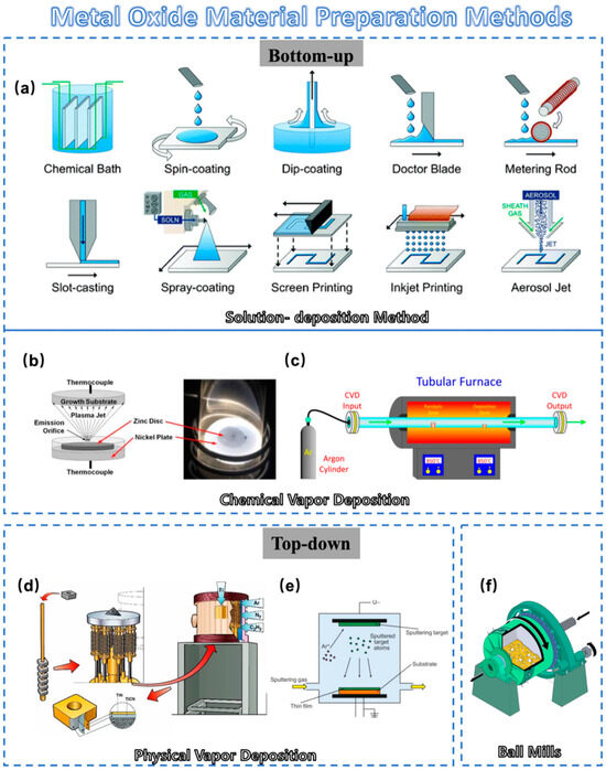 - Physical Vapor Deposition: As one of the most common processes on the market (Figure 2d), PVD offers distinct advantages compared to other methods for preparing metal-oxide materials [36]. It excels in its precision at the micro- and nanoscale, resulting in high-quality, uniformly dense films (Figure 2e). Moreover, PVD operates at lower temperatures, reducing the risk of thermal stress [39]. PVD films are high-purity, environment-friendly, and compatible with most materials and substrates. These attributes render PVD highly sought after in electronic/optical coatings and material enhancement [40,41]. PVD methods for preparing metal-oxide materials encompass magnetron sputtering, laser deposition, ion beam deposition, molecular beam epitaxy, thermal evaporation, etc. These techniques play an important role in preparing metal-oxide films with desired structural properties [42,43,44,45,46,47].