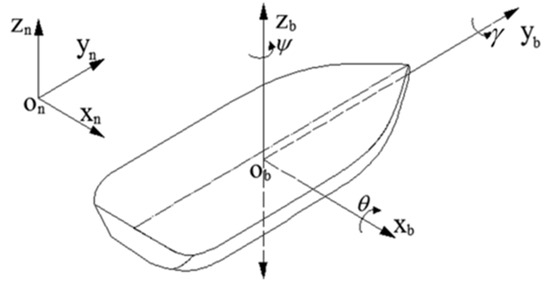 where , , , , and denote the speed in the navigation coordinate system, acceleration in the carrier coordinate system, the projection of gravitational acceleration in the navigation coordinate system, attitude matrix, and the Earth’s rotation and Colombian compensation term, which can be ignored when the ship speed is small.