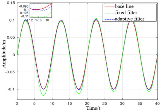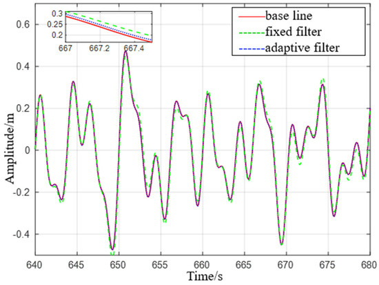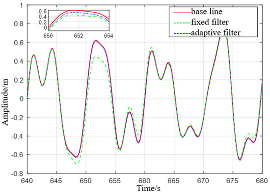 It can be seen from Figure 10 that the adaptive delay−free high−pass filter matches the reference value, and the fixed−parameter complementary high−pass filter matches the reference value overall, but there are some errors at the peak. After the sea condition changes, it can be seen from Figure 11 that the adaptive delay−free high−pass filter also matches the reference value, but the fixed−parameter complementary high−pass filter has a large error in the time period of 645 s to 655 s, and the performance is poor.
