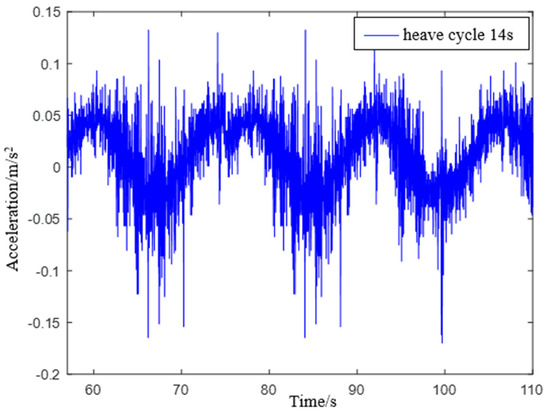 Simulate a wave heave motion with a maximum amplitude of approximately 0.20 m and a period of approximately 14 s for 600 s. Collect experimental data using IMU440, select the acceleration in the heave direction during the 54–110 s period as shown in Figure 17, and compare the filtering results as shown in Figure 18.