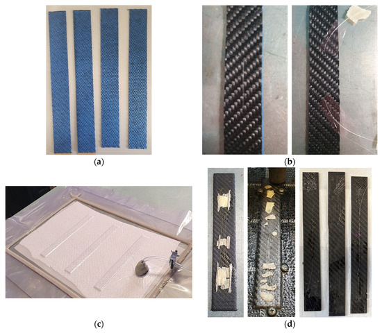 Specimen preparation: (a) hand-cut pre-pregs strips; (b) optic fiber threading through two plies, optic fiber tensioning and release film interposing to avoid adhesion; (c) vacuum-pack for cure cycle; (d) waterjet cutting after curing cycle and final specimens.