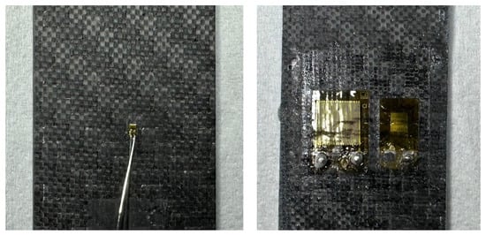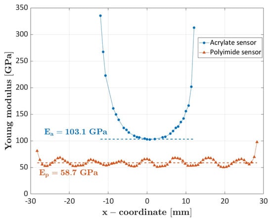 Regarding the polyimide sensors (Figure 5a), the Young’s modulus calculated with the embedded sensor has a slightly higher value (61.5 GPa) than that calculated from the strains measured by the sensor glued on the surface (58.7 GPa). The embedded sensor also shows very limited oscillations, which are also less regularly repeated than those obtained through the superficial sensor. Indeed, as the oscillations on the surface can be correlated to the fabric structure of the material, the measurement of the internal sensor is affected by both the upper and lower layers within which it is embedded, thus leading to nonperiodic oscillations and to limited amplitude variations. The lower mean value of the Young’s modulus obtained with the glued sensor can be due to free-surface effects, where the deformations are not restrained by proximal layers.