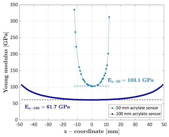 Comparison of the elastic modulus obtained from the acrylate optic sensors glued on the specimen for a length of 50 mm and 100 mm.
