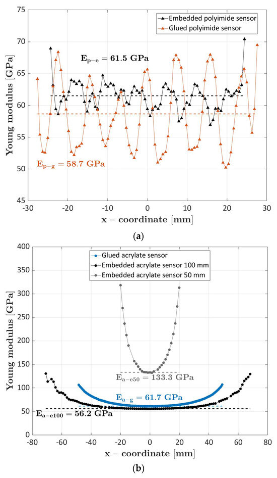 Figure 5 shows the comparison of the calculated Young’s modulus for embedded and glued optic fibers. Figure 5a shows the results for the polyimide sensors (specimen #4 with glued sensor, specimen #5 with embedded sensor), while in Figure 5b the results of the acrylate sensors (specimen #1 and #2 for embedded sensors and specimen #6 for the glued sensor) are reported.