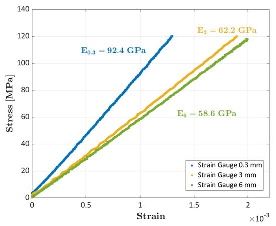 The slope of the curve was clearly different between the three strain gauges and the Young’s modulus resulted equal to 92.4 GPa (0.3 mm strain gauge), 62.2 GPa (3 mm strain gauge), and 58.6 GPa (6 mm strain gauge). These consistent variations can be explained again by considering the nonhomogeneous strain field as result of the inhomogeneous meso-scale structure of the material. Figure 7 shows a magnification of the location of the three strain gauges.
