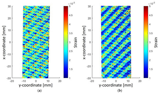 As shown, the strain field is inhomogeneous within the specimen, as result of the inhomogeneous meso-structure of the material constituted by longitudinal and transverse yarn with respect to the applied load. Indeed, transverse yarns, which can be seen as local unidirectional composite oriented at 90° with respect to the applied load, deform more than longitudinal tows. It is also possible to notice in the second specimen (Figure 8b) the woven pattern is easily recognizable through the bands of almost uniform deformation, while the strain field of the first specimen (Figure 8a) is more scattered. This can be attributed to the relative position of the material layers along the thickness direction: if the longitudinal and transverse tows of the two superficial layers perfectly superimpose, then the characteristic strain map is the result of almost uniform deformation bands [24].